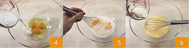 Mientras tanto, prepara la masa de los muffins: en un bol bate los huevos y la leche con un batidor (4-5), añade el aceite de girasol en hilo, y continúa batiendo hasta obtener una mezcla homogénea 6.