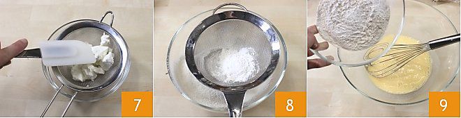 Cierne cuidadosamente la ricotta 7 y la harina 00 a la que habrás añadido la levadura 8, luego incorpóralas a la mezcla y mezcla bien para amalgamar todos los ingredientes 9.