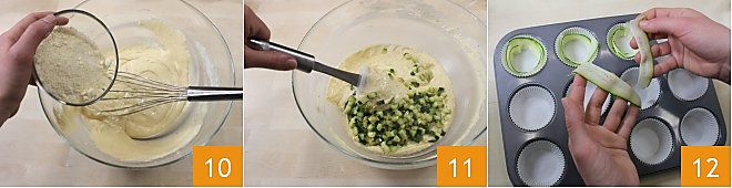 Añade ahora el Grana Padano rallado 10 y ajusta de sal y pimienta. Cuando los calabacines estén cocidos, agrégales a la mezcla y mezcla bien todo con una espátula 11, luego transfiere la mezcla obtenida en una manga pastelera y coloca en una bandeja de muffins 12 moldes de papel. Corta a la mitad, a lo largo, las 12 rodajas de calabacín que habías reservado y forra los bordes de los moldes, usando dos mitades por cada muffin 12.