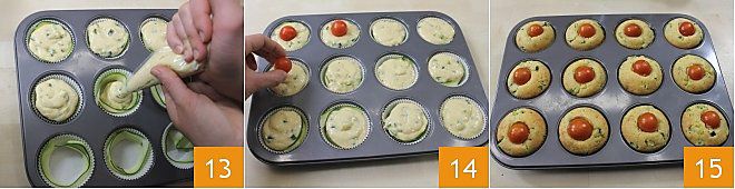 Añade la mezcla rellenando los moldes hasta el borde 13 y adorna cada muffin con un tomatito 14. Hornea todo en horno estático ya caliente, a 180°, durante unos 30 minutos, hasta que se hayan hinchado bien y la superficie esté dorada 15. Una vez cocidos, disfruta de los muffins salados con ricotta y calabacines aún tibios, o fríos.