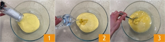 Para realizar los nachos, empezad preparando las tortillas: verted la harina de maíz precocida en un bol junto con la sal 1 y el agua tibia 2, luego mezclad todo con una cuchara 3.