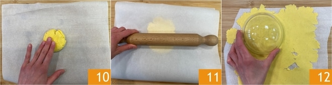 Pasado este tiempo, colocad la primera bola sobre una hoja de papel de horno y aplanadla con las manos 10, luego cubrid con otra hoja de papel de horno y estirad con el rodillo hasta formar una lámina muy fina 11. No os preocupéis si tiende a romperse, podéis reutilizar los restos teniendo cuidado de cubrir la masa mientras esperáis para que no se seque. Cortad la lámina con un cortapastas o un bol de 12 cm de diámetro 12.