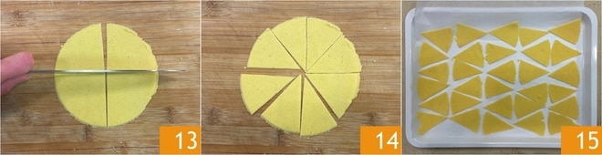 Dividid el disco de masa primero en cuartos 13 y luego en octavos para obtener 8 triangulitos iguales 14. Colocad los triangulitos en una bandeja forrada con papel de horno 15 y proceded de la misma manera para estirar las otras bolas, teniendo siempre cuidado de mantener cubierta la masa que no estéis trabajando. Podéis superponer los triangulitos en la bandeja a medida que los cortáis.