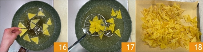 Pasad a la cocción: en una sartén amplia calentad una capa de aceite de semillas hasta alcanzar una temperatura de 180°, luego colocad unos pocos triangulitos a la vez 16. Después de un par de minutos, dadles la vuelta con una espumadera y freíd por otros 2 minutos. Escurrid los nachos 17 sobre papel absorbente y dejad enfriar completamente 18. En este punto, los nachos pueden disfrutarse solos o sazonados.