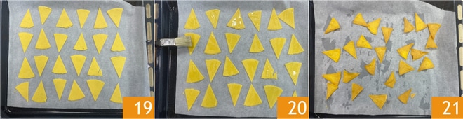 Para cocer los nachos al horno, colocad los triangulitos de maíz en una bandeja forrada con papel de horno 19, luego pinceladlos con aceite de semillas de cacahuete 20. Coced en horno ventilado precalentado a 190° durante 13 minutos, luego sacadlos del horno y dejadlos enfriar 21. ¡Vuestros nachos al horno están listos para ser disfrutados o sazonados!