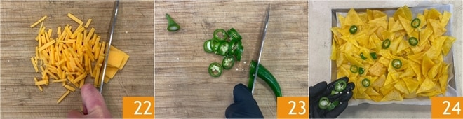 Para realizar los nachos con queso, picad finamente el cheddar 22 y cortad el chile en rodajas 23. Distribuid los nachos en una bandeja forrada con papel de horno y adornad con las rodajas de jalapeño 24.