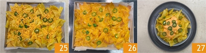 Espolvoread uniformemente los nachos con el cheddar picado 25. Precalentad el horno en modo grill a 210° y hornead durante 5 minutos o hasta que se derrita el queso 26. ¡Servid vuestros nachos con queso aún calientes 27!