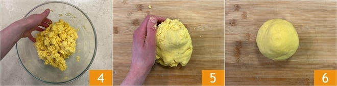 Continuad mezclando los ingredientes en el bol con las manos 4, luego trasladad la mezcla a la superficie de trabajo y amasad 5 hasta obtener una consistencia lisa y homogénea 6.