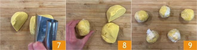 Dividid la masa en 5 porciones de aproximadamente 100 g cada una 7, dad a cada bola una forma redonda 8 y envolvedlas en film transparente 9. Dejad reposar a temperatura ambiente durante 5 minutos.