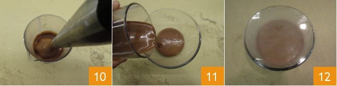 En este punto trabaja la crema con una batidora de inmersión, sin incorporar aire manteniendo la batidora siempre sumergida 10, hasta que quede lisa, fluida y brillante. En este punto transfiérela a un bol 11. Cubre con film transparente 12 y deja cristalizar en el frigorífico durante 12 horas.