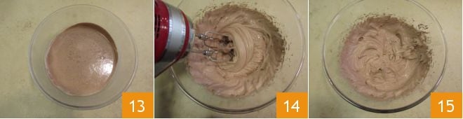 Transcurrido este tiempo, saca la namelaka del frigorífico 13. Quedará compacta y cremosa, perfecta para usar como relleno en un dulce. De lo contrario, trabájala con las varillas eléctricas durante unos minutos 14, de esta manera quedará aireada 15 y perfecta para decorar muchísimos postres.