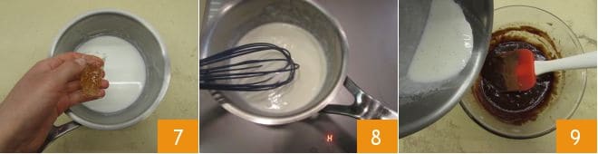 Escurre la gelatina y añádela en el cazo 7. Mezcla con un batidor para disolverla completamente 8 y viértela en la mezcla de chocolate 9. Vuelve a mezclar con una espátula 9.