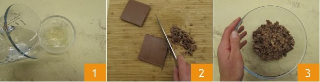 Para preparar la namelaka de chocolate con leche, lo primero es poner la gelatina a remojo en agua fría 1. Pica finamente el chocolate 2 y transfierelo a un bol 3.
