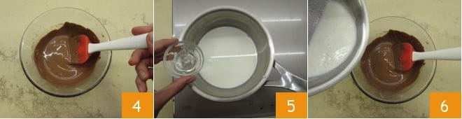 Derrite el chocolate en el microondas, activándolo pocos segundos a la vez y removiendo a menudo para que no se queme 4. Vierte en un cazo la leche, la nata, la glucosa 5 y lleva a punto de ebullición. En este punto vierte aproximadamente la mitad dentro del chocolate 6 y mezcla con la espátula.