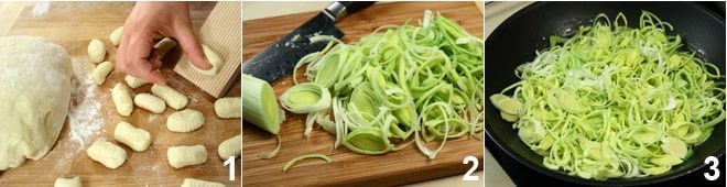Prepara los ñoquis de patata (haz clic aquí para ver la receta) y déjalos reposar en un lugar fresco cubiertos con un paño ligeramente enharinado 1. Mientras tanto, prepara la salsa que te servirá para condimentar los ñoquis, comenzando a cortar el puerro en rodajas finas 2 y dejándolo pochar a fuego lento en una sartén grande con el aceite y la mantequilla ya calientes 3.
