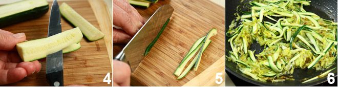 Corta entonces los calabacines eliminando la parte central 4 y córtalos en juliana 5. Échalos en la sartén junto con el puerro pochado y deja cocer 6.