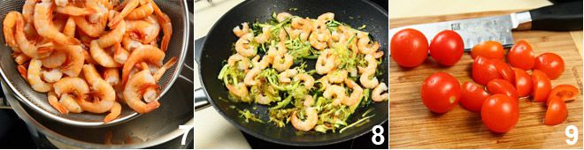 Mientras tanto, hierve las gambas en agua hirviendo durante unos tres o cuatro minutos, escúrrelas y pélalas. Únelas al puerro y a los calabacines en la sartén 8. Corta los tomates cherry en gajos 9 y échalos en la sartén. Apenas empiecen a ablandarse, añade el tomate triturado y deja cocer durante otros cinco minutos 10.