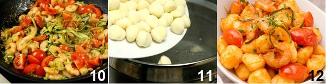 Mientras tanto, después de llevar a ebullición una olla con agua salada, hierve los ñoquis 11, escúrrelos bien y únelos a la salsa en la sartén. Sirve tus ñoquis con puerro y gambas bien calientes añadiendo un espolvoreado de perejil fresco 12.
