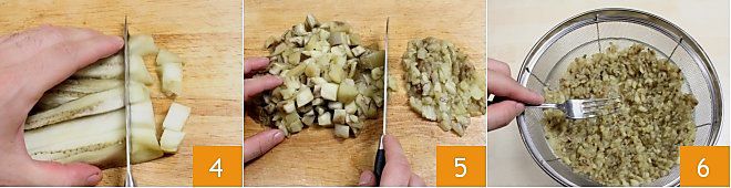 Ahora corta la pulpa en rodajas finas y luego redúcelas a dados 4, después pícalas nuevamente con un cuchillo o ayudándote con una mezzaluna 5. Coloca la pulpa de berenjena en un colador y con la ayuda de un tenedor presiona para eliminar todo el líquido presente 6.