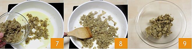 En una sartén, calienta un chorrito de aceite y un diente de ajo; apenas el ajo esté bien dorado, añade la pulpa de berenjena picada 7 y saltéala durante unos 10 minutos a fuego vivo, removiendo de vez en cuando 8. Cuando las berenjenas estén listas, viértelas en un bol y resérvalas para que se templen 9. Reserva también la sartén que utilizaste para saltear las berenjenas.