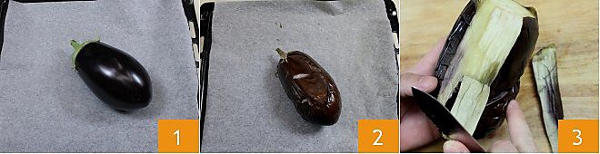 Para preparar los ñoquis de berenjena con tomates cherry y albahaca, comienza lavando las berenjenas bajo agua fría corriente. Luego sécalas cuidadosamente con un paño de cocina y colócalas en una bandeja de horno forrada con papel de hornear 1. Entonces cocínalas en el horno a 200° durante 40-45 minutos. Tan pronto como las berenjenas estén listas, sácalas del horno y déjalas templar 2. Luego quítales el pedúnculo y el extremo y pélalas delicadamente ayudándote con un cuchillito para eliminar la piel exterior 3.