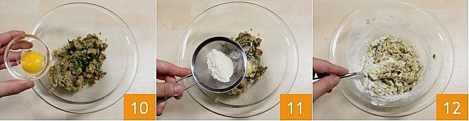 Cuando la pulpa de berenjena en el bol esté templada, añade las hojas de albahaca desmenuzadas con las manos, el huevo 10, una pizca de sal, una pizca de pimienta e incorpora la harina tamizada y por último 3 cucharadas de queso parmesano 11. Mezcla el compuesto ayudándote con un tenedor 12 hasta obtener una masa compacta y homogénea.