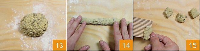 Cuando los ingredientes estén integrados, forma una bolita con el compuesto obtenido y transfiérela a una superficie de trabajo que habrás espolvoreado con un poco de harina 13. Luego, comienza a realizar los ñoquis: estira la masa con las manos para crear cilindros del grosor de 2-3 centímetros 14; corta tus ñoquis de aproximadamente 2-3 cm de lado. Para dar a los ñoquis una forma más definida, realiza las características estrías haciendo deslizar cada ñoqui sobre la tabla de madera específica 18 o pasándolos por los dientes de un tenedor.