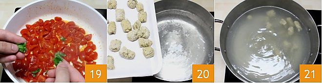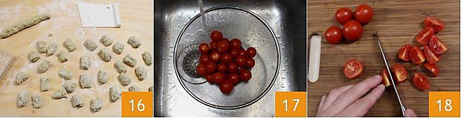 A medida que los hagas, colócalos sobre la misma superficie ligeramente enharinada 16. Termina de realizar los ñoquis con el resto de la masa 19 y transfiérelos a una bandeja enharinada para dejarlos reposar 15 minutos, así facilitarás también el paso a la olla para la cocción. Mientras tanto, lava los tomates cherry bajo agua corriente 17 y córtalos en gajos 18.