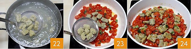 Para escurrirlos utiliza una espumadera 22 y transfiérelos poco a poco directamente a la sartén con los tomates cherry 23. Enciende el fuego bajo, mezcla todo por unos segundos, apaga y sirve tus ñoquis de berenjena con tomates cherry y albahaca con algunas hojas frescas de albahaca 24 ¡aún!