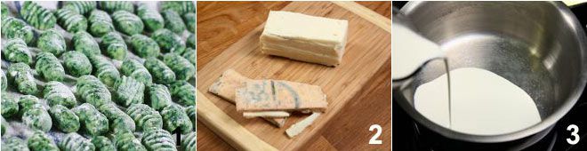Prepara los gnocchetti de espinacas 1 siguiendo nuestra receta que encontrarás haciendo clic aquí. Elimina la corteza del taleggio y corta el queso en trozos 2; vierte la nata en una cacerola 3