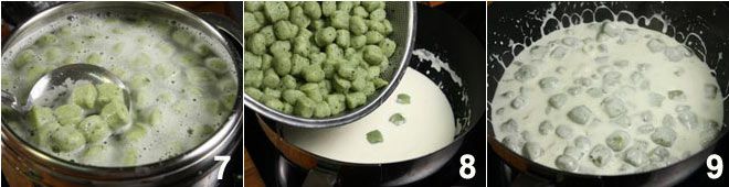 y añade el taleggio cortado en trozos 4 y déjalo derretir a fuego lento, luego deja que espese ligeramente, añade la pimienta blanca molida 5, ajusta de sal si es necesario y apaga el fuego. Luego cuece los ñoquis en abundante agua salada 6,