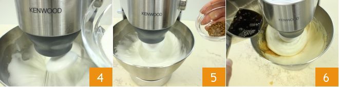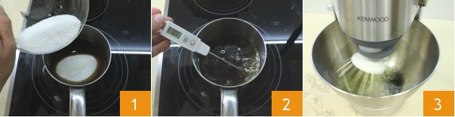 añade 50 gr de azúcar granulada 4 y tan pronto como se tornen blancas, añade el café soluble en gránulos 5. Las claras deben estar ya bien montadas cuando el jarabe llegue a los 121°C. Cuando el jarabe haya alcanzado la temperatura indicada arriba, viértelo en las claras en forma de hilo 6, continuando batiendo con las varillas hasta que el merengue esté completamente enfriado.