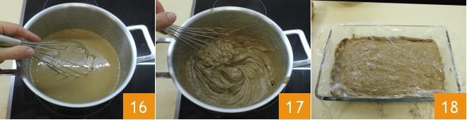 y lleva a ebullición a fuego medio 16, continúa la cocción hasta obtener una crema densa y compacta 17 continuando removiendo con la batidora. Transfiere la crema obtenida a una fuente, cubre con film transparente en contacto con la superficie de la mezcla 18, deja templar y luego coloca la crema en el frigorífico para que se endurezca al menos una hora.