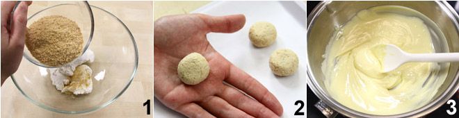 Para preparar los ojos ensangrentados, empezad mezclando en un bol el requesón con las galletas secas trituradas 1, añadid 50 g de chocolate blanco que habréis derretido al baño maría (o en microondas) y dejado templado. Mezclad enérgicamente con una cuchara de madera para amalgamar bien todos los ingredientes. Con esta masa, formad bolitas de unos 3 cm de diámetro, ligeramente aplastadas 2 y colocadlas en una bandeja cubierta con papel de horno, poned en el congelador durante 15 minutos para que se solidifiquen y endurezcan. Mientras tanto, derretid el chocolate blanco restante al baño maría 3 (o en microondas) hasta que esté lo suficientemente fluido como para usarlo como cobertura.