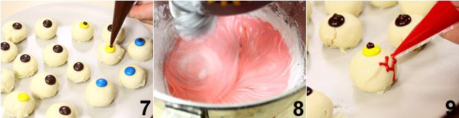 Con el chocolate negro derretido, realizad la pupila sobre cada confite de chocolate ayudándoos con una manga pastelera o con un palillo 7. Por último, preparad el glaseado real rojo para realizar las venas del ojo: montad la clara de huevo en una batidora y cuando esté bien blanca, añadid el azúcar glas tamizado, añadid finalmente tanto colorante rojo como sea necesario para obtener un buen rojo intenso 8. Poned el glaseado en una manga pastelera a la que habréis cortado la punta obteniendo un orificio muy pequeño y con esta última realizad las venas rojas alrededor del ojo, comenzando desde la base del ojo y dibujando venas irregulares hacia la pupila 9.
