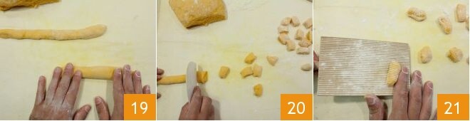 Luego, retoma la masa de los ñoquis del frigorífico, divídela en piezas y manéjalas para crear pequeñas barras 19; con una espátula o la hoja de un cuchillo ligeramente enharinada realiza los ñoquis 20 a los que puedes dar la típica estría con el rallador de ñoquis 21 o pasando los ñoquis sobre los dientes de un tenedor. A medida que los realices, coloca los ñoquis en una bandeja ligeramente enharinada.
