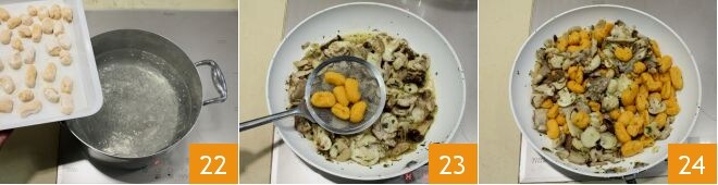 Una vez listos, cuece los ñoquis en una olla grande con abundante agua salada al gusto 22: tardarán unos instantes, cuando los ñoquis suban a la superficie, escúrrelos con una espumadera y pásalos directamente a la sartén con el condimento 23. Saltéalos unos instantes a fuego lento, añade pimienta y mezcla para sazonar todo y tus ñoquis de zanahorias con setas variadas estarán listos para ser disfrutados!