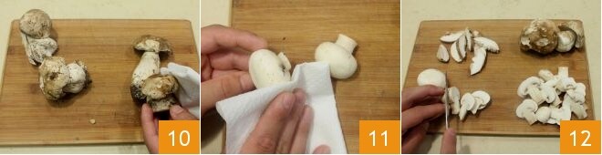 Cómo limpiar los boletus raspando el tallo con un cuchillo con delicadeza hasta eliminar cualquier rastro de tierra, luego con un paño de algodón 11; separa los sombreros de las setas de los tallos y si estuvieran todavía muy sucios, pásalos rápidamente bajo un chorro de agua fría. Limpia con un paño de algodón también las setas champiñón 11, enjuágalas brevemente bajo agua corriente, luego corta las cabezas y los tallos de las setas limpias en rodajas finas 12.