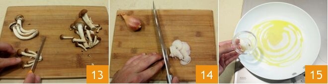 Para las setas chiodini, corta la parte final del tallo 13, enjuágalas bajo agua corriente y escáldalas durante al menos 15-20 minutos en abundante agua hirviendo eliminando de vez en cuando los residuos en la superficie con una espumadera. Una vez terminada la limpieza de las setas, pela y pica una chalota 14, luego vierte en una sartén amplia el aceite y un diente de ajo entero (lo podrás quitar posteriormente) 15.
