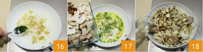 Deja pochar la chalota y dorar el diente de ajo a fuego lento, luego añade el perejil picado 16 y las setas 17; saltéalas unos minutos luego rocía con el vino blanco 18, déjalo evaporar y apaga el fuego.