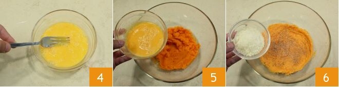 después casca los huevos, bátelos con un tenedor 4 y añádelos a las zanahorias 5; mezcla, luego añade el pecorino rallado 6,