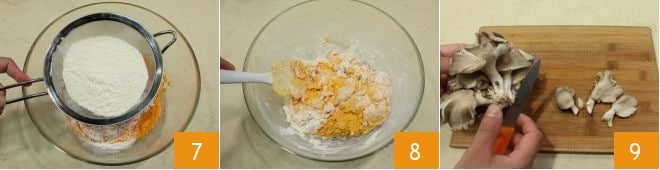 la nuez moscada y la harina tamizada 7. Mezcla con una espátula la masa 8 y cúbrela con film plástico para dejarla reposar en la nevera al menos media hora. Mientras tanto prepara el condimento, pasando a la limpieza de las setas: con un paño de cocina limpia la superficie de los sombreros de las setas pleurotus y el tallo para eliminar el sustrato, luego con un cuchillo separa los tallos del racimo 9 y si es necesario pasa el paño sobre los sombreros y las láminas internas para eliminar cualquier rastro de tierra.