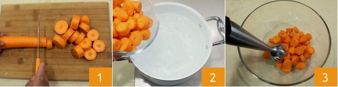 Para preparar los ñoquis de zanahorias con setas variadas, empieza por la masa: pela las zanahorias con un pelador de verduras y corta las zanahorias en rodajas bastante gruesas 1, luego hazlas hervir en una olla con agua ligeramente salada 2. Cuando las zanahorias estén blandas (tardarán unos 15 minutos), escúrrelas y déjalas enfriar. Luego tritura las zanahorias con la batidora de mano 3,