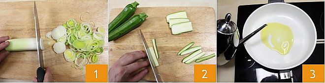 Para preparar las orecchiette con yogur y calabacines, comienza limpiando y cortando las verduras: elimina las hojas verdes y las más externas y córtalas finamente 1, luego quita los extremos de los calabacines y córtalos en juliana 2. En una cacerola, calienta tres cucharadas de aceite de oliva 3