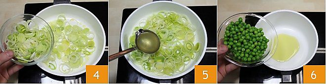 y añade el puerro 4 dejándolo cocinar mientras añades un cucharón de caldo vegetal para prolongar la cocción 5. En otra sartén más pequeña, pon una cucharada de aceite de oliva y añade los guisantes 6,