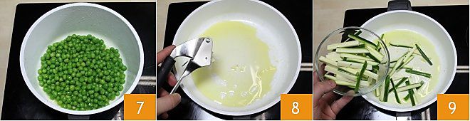 déjalos cocinar durante 15 minutos 7 y también en este caso añade el cucharón de caldo y deja cocinar por unos minutos. Los guisantes deben quedar de un bonito color verde brillante y bastante crujientes. En otra olla, añade el aceite restante y aplasta el diente de ajo 8. Añade los calabacines al aceite y déjalos cocinar por unos minutos 9,