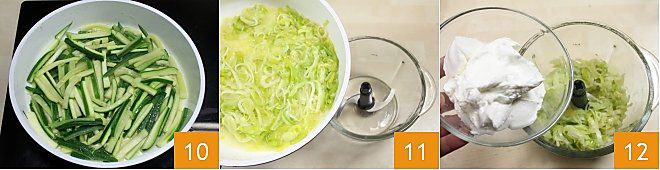 los calabacines no deben deshacerse, sino permanecer intactos 10. Cuando los puerros estén cocidos, colócalos en una batidora 11 junto con el yogur 12