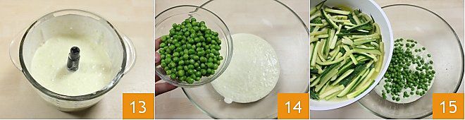 y bate todo hasta obtener una crema homogénea 13. En un bol vierte la crema de yogur, los guisantes 14, los calabacines 15, sala y pimienta
