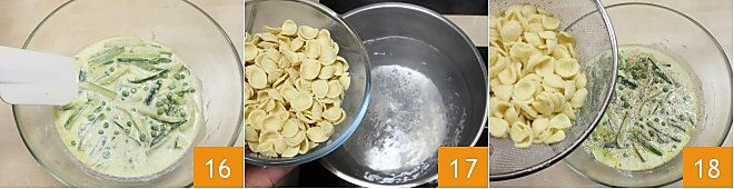 y mezcla bien todo 16. Luego cuece las orecchiette en abundante agua con sal 17, una vez que la pasta esté cocida, viértela en el bol 18 junto con la crema de yogur y verduras,