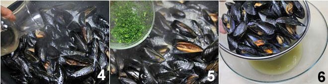 Cuando veáis que comienzan a abrirse, saltead con el vino blanco 4 y añadid la mitad del perejil picado total 5. Una vez abiertos todos los mejillones, escurridlos bien, teniendo cuidado de recoger en un cuenco el agua de cocción que servirá al final para dar sabor a la pasta 6.